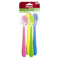 These are very good spoons for beginners, I sued since my baby was 4.5 month old. The are soft flexible and not too big for their little mouths. The long handle is a plus in the beginning as well, but it can also cause the spoons to fall out of the bowl because it is so long. The biggest drawback for me is that after a short period of use, the edges on the back of the spoons start peeling off (the thin layer of plastic or something starts coming off), and I stop using them and buy another set, which is much cheaper at babiesrus by the way. Also, if you use them on like sweet potatoes or carrots, the spoons may change color to an orange hue, not the handles though. All in all, I would recommend it anyway because I found them to be most comfortable spoons, but you need to change them after a while.